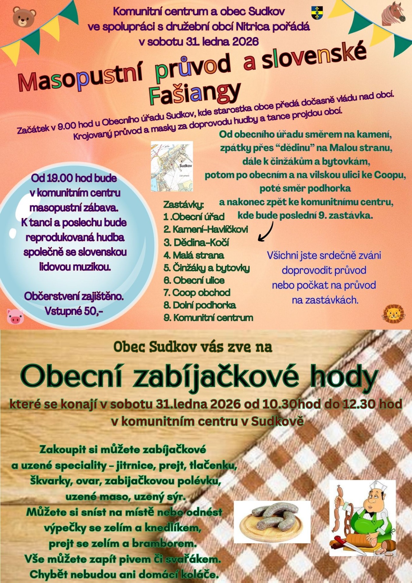 V sobotu 31.ledna vás srdečně zveme na Masopust a slovenské Fašiangy, spolu s obecní zabíjačkou. Informace se dozvíte z plakátu.