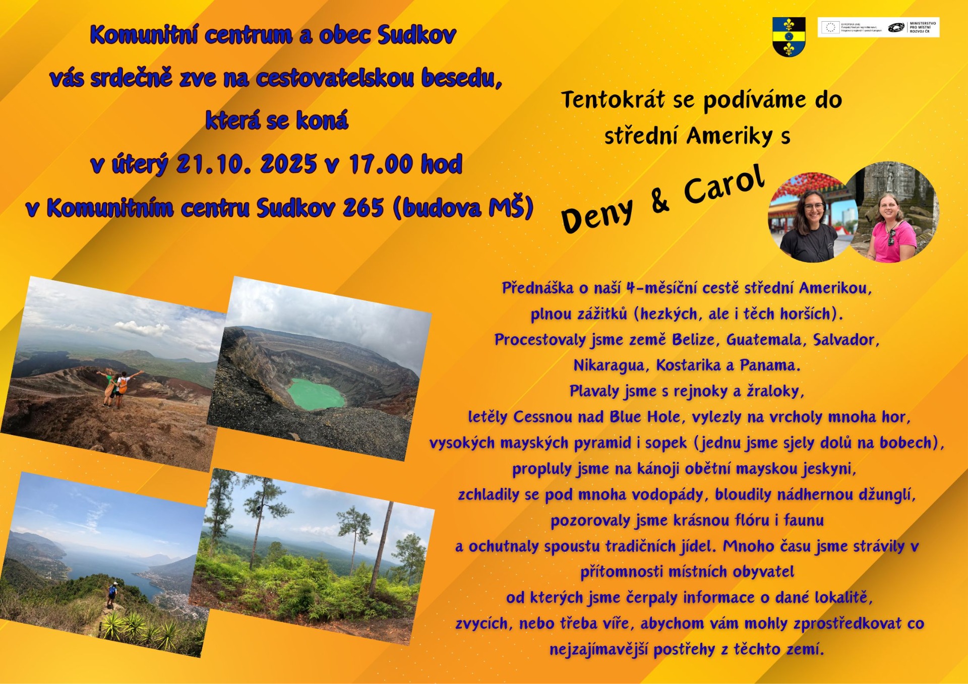 V úterý 21.10. vás zveme na cestovatelskou besedu a tentokrát se podíváme do střední Ameriky. Začátek v 17.00 hod v Komunitním centru v Sudkově. Srdečně vás zveme.