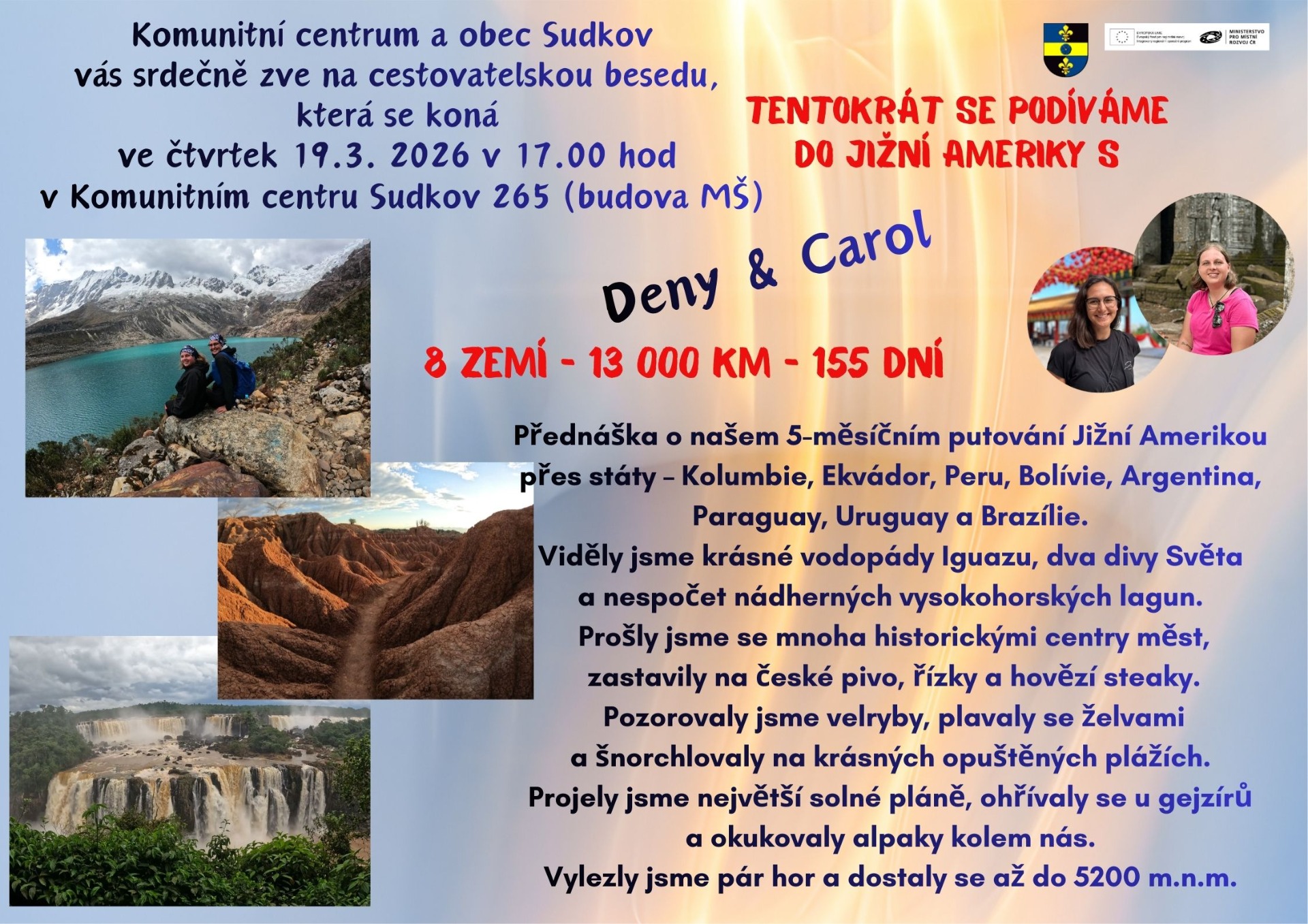 Tentokrát ve čtvrtek 19.3. 2026 v 17.00 hod všechny srdečně zveme na další cestovatelskou besedu. Navštíví nás opět Dany a Carol a svým poutavým a vtipným vyprávěním nás vezmou do jižní Ameriky. Těšíme se na vaši návštěvu.